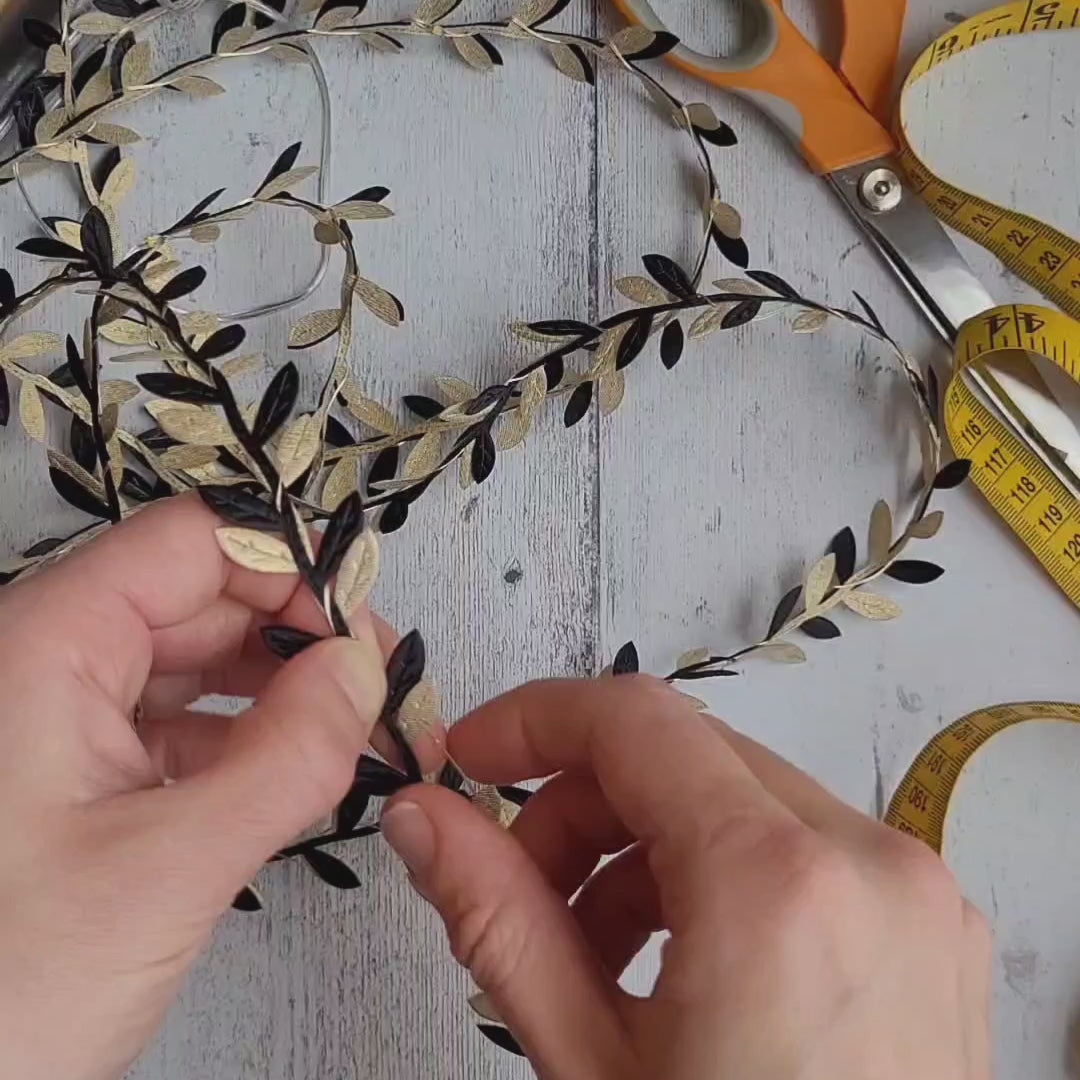 🖤 This battery operated black & gold leaf fairy light garland with warm white mini LEDs is perfect for your home, wedding or party decor. This pre-lit garland is a wonderful decoration that you can take home and use all year round to remember your special day!