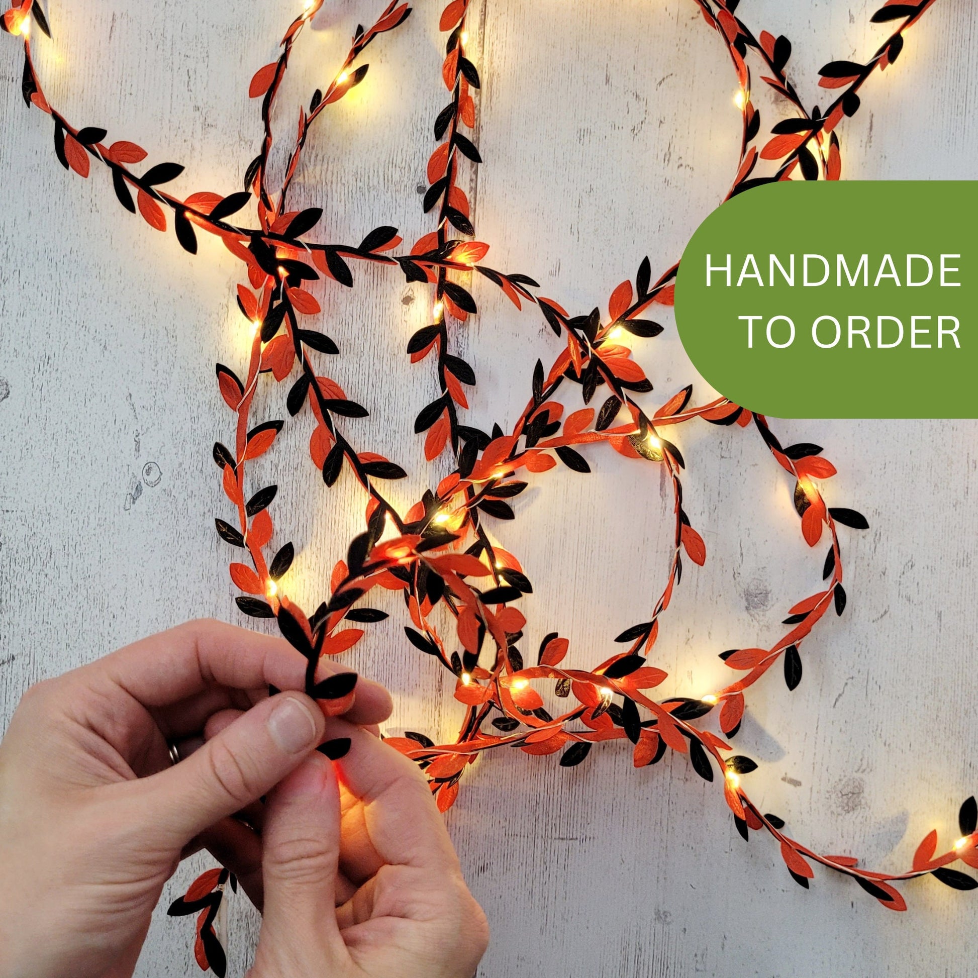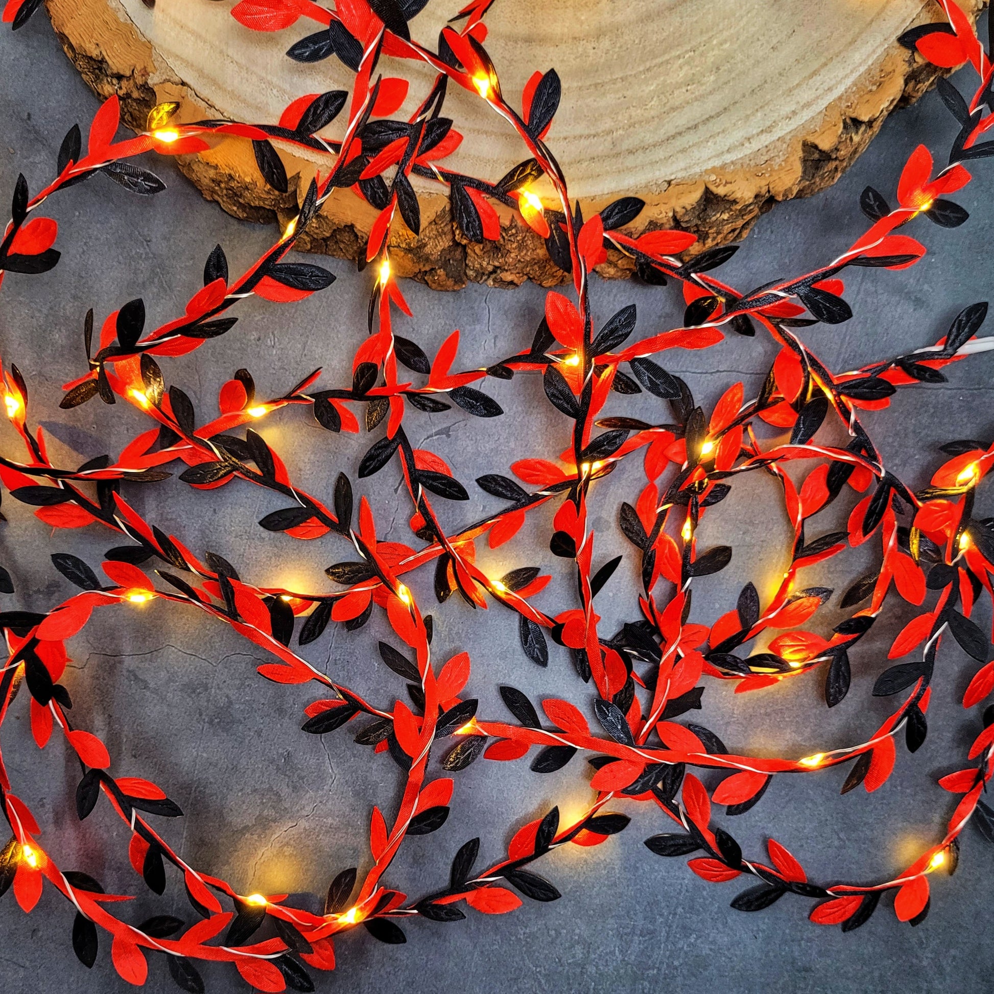 🌿 This gothic black & red leaf fairy light garland with warm white mini LEDs is perfect for your home, wedding or Halloween event decor.