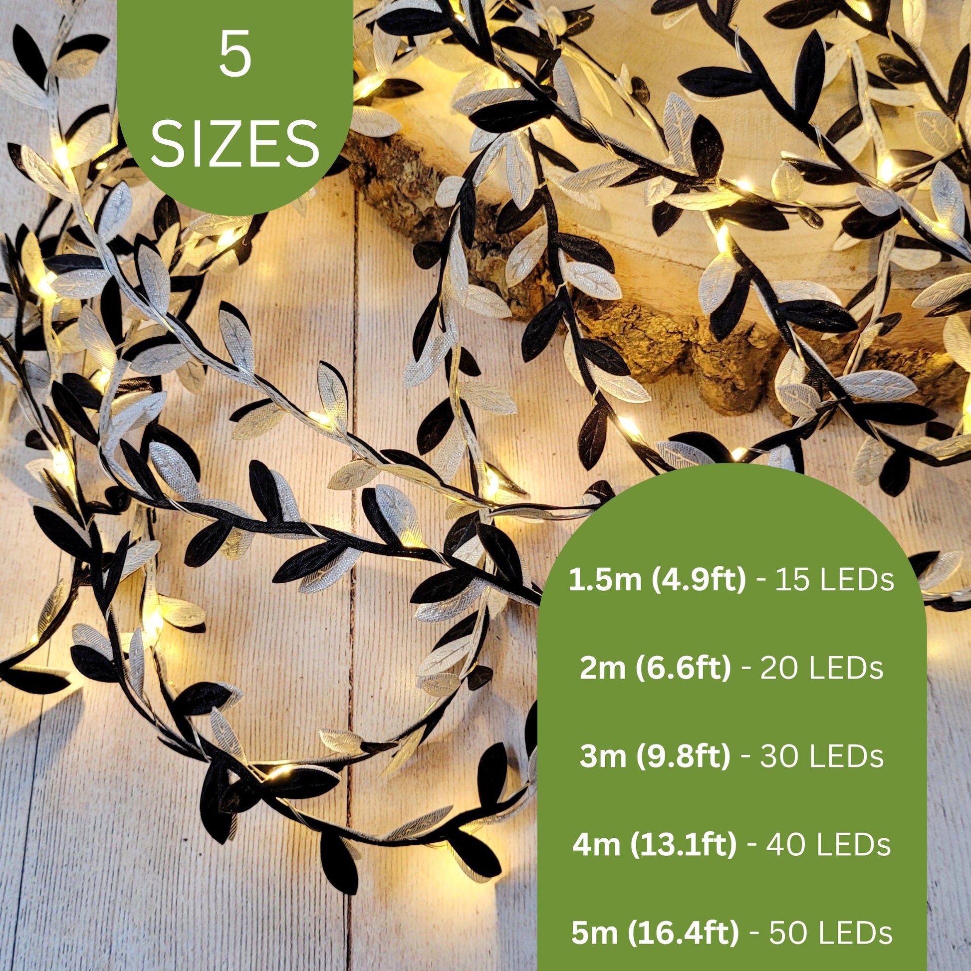 🖤 This gothic black and silver leaf fairy light garland with warm white mini LEDs is perfect for your home, wedding or party decor.
