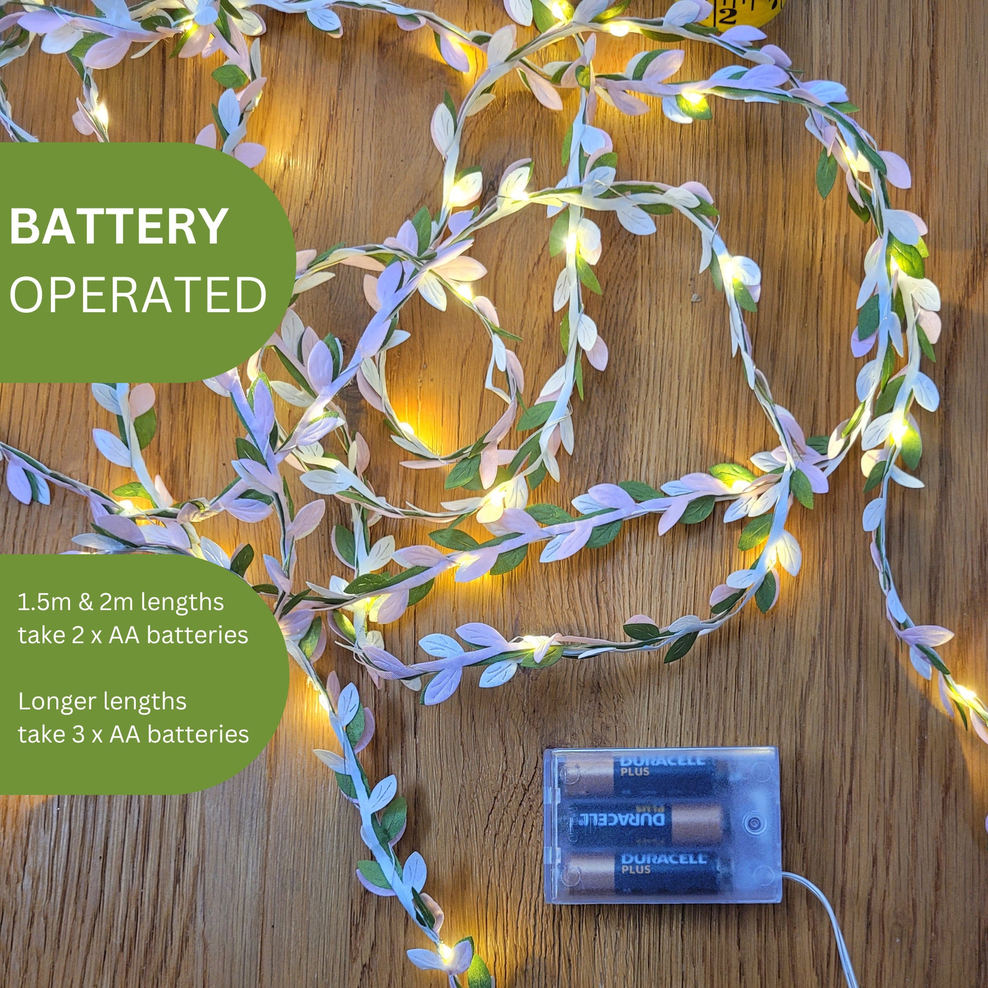 1.5m & 2m lights take 2 x AA batteries (not included)